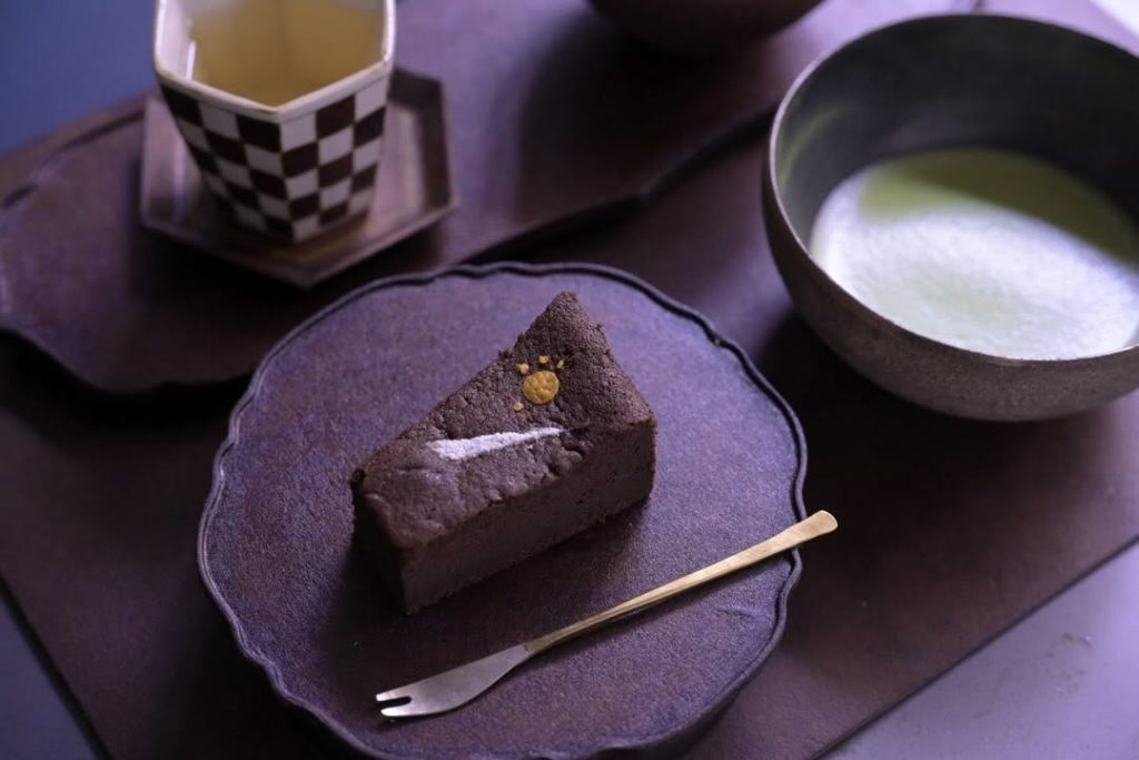 中央には十勝アルプスファームのミルクアイスとドライ蜜柑を、脇には紅茶寒天と煎茶のケーキを添えています。