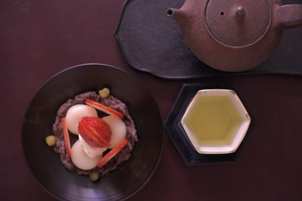 お菓子は軽羹の生地で粒餡と苺を挟みました。華やかなお茶と共にお召し上がりいただけます。