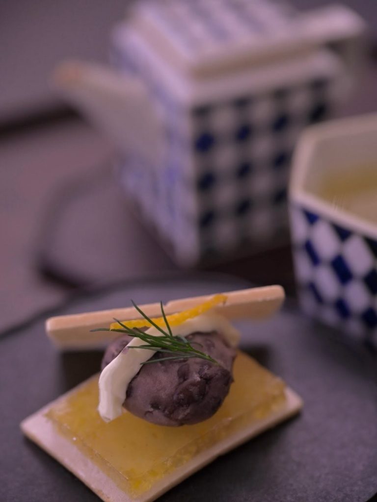柚子羹と粒餡にクロテッドクリームを乗せ、柚子皮とディルを添えて、焼き立ての最中に挟みました。